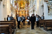 Für das Orchester des Akkordeonclubs Wendlingen war es ein besonderer Termin: das Konzert in der Wieskirche im Allgäu. Mitspieler Manfred Jakob hatte einen wunderbaren Ausflug organisiert. Gestartet war man am Samstagmorgen mit dem Bus. Leider bei nasskaltem Wetter. Nach kurzem Zwischenstopp traf man in der Wieskirche ein. Imponierend war für alle die Helligkeit und die herrlichen Malereien an Wand und Decke der Kirche. Ein Konzert in dieser beeindruckenden Kulisse zu spielen, war für alle ein besonderes Erlebnis. Auch die durchweg positive Resonanz der anwesenden Besucher erfreute die Musiker sehr. Eine Besucherin meinte sogar, dass ihr Urlaub durch unser Konzert zu einem Highlight geworden wäre. Die Dirigentin des Orchesters hatte Stücke ausgesucht, welche ein Akkordeonorchester in einer Kirche fast wie eine Orgel klingen lassen. Gänsehaut inklusive. Der nächste Programmpunkt war eine Schifffahrt auf dem Forggensee. Als etwas befremdlich fand man zwar die Anlegestelle, die eigentlich nur als Strand zu erkennen war und man sich nicht vorstellen konnte, dass etwas größeres als ein Schlauchboot hier anlegen könnte. Doch die Gruppe war sehr erleichtert als die ankommende Fähre alle wohlbehalten an Bord nehmen konnte. Die Fahrt wurde genutzt um Kaffee zu trinken und Kuchen zu essen, denn die Sicht war durch den erneut einsetzenden Regen sehr eingeschränkt. Im Hotel angekommen, wurde der Wellnessbereich mit Hallenbad und Sauna rege ausgekostet und das darauffolgende Menü stillte die hungrigen Reisenden. Am nächsten Morgen strahlte die Sonne vom Himmel. Der Tegelberg stand auf dem Plan. Man fuhr mit der Gondel nach oben und vertrat sich auf dem Plateau die Füße. Andere der Gruppe wollten es sportlicher und erklommen den Gipfel. Da die Abreise kurz bevor stand, nutzte die Gruppe zur Abfahrt ebenfalls die Gondel, nicht ohne sich vorzunehmen, die angebotenen Wanderungen das nächste Mal intensiver zu nutzen. Auf der Heimreise fand noch ein Zwischenstopp in Marktoberdorf statt. Beim ehemaligen Vorsitzenden Rolf Müller spielte das Orchester ein Überraschungsständchen. Für viele ein Wiedersehen nach etlichen Jahren. Nach einem leckeren Abendessen trat die Gruppe die Heimfahrt an. Ein rundum gelungener Ausflug ging zu Ende.